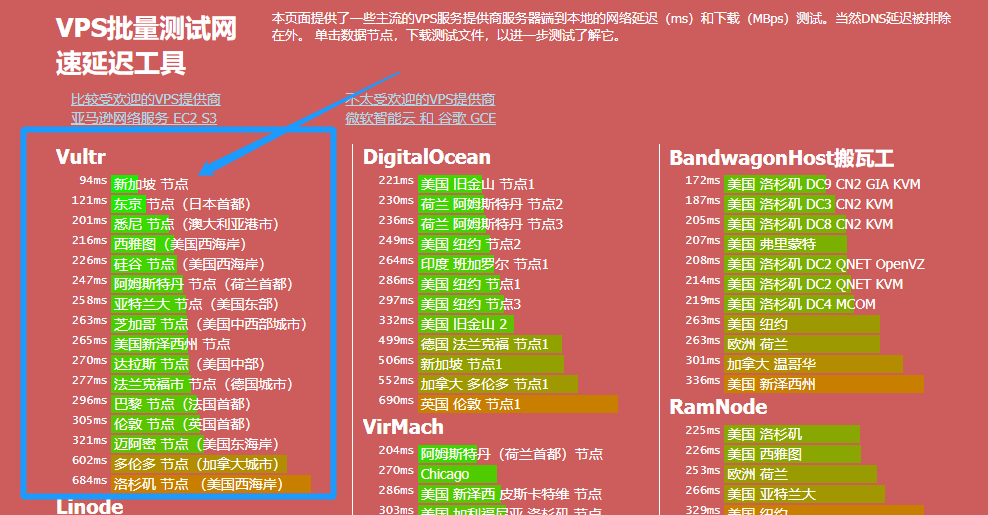 通过VPS批量测试网络延迟工具,我们可以看到vultr家新加坡的服务器离我们所在地的网速延迟是最低了