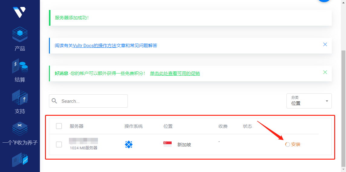 最下面看到刚刚所创建的VPS正在安装中