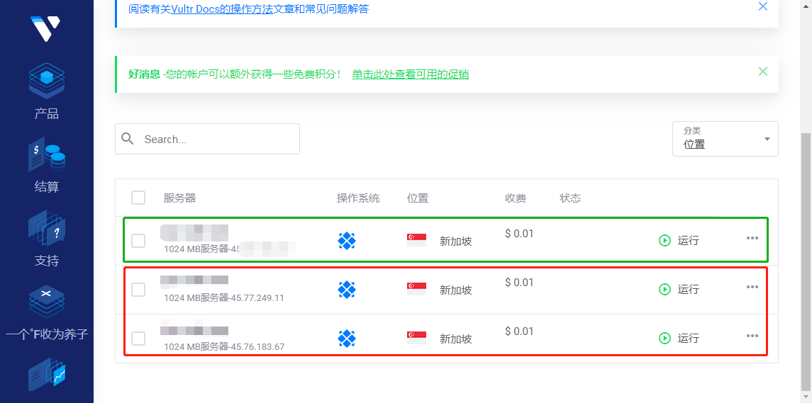 因为现在vultr基本上快被玩坏了,所以这里我连着创建了三台VPS,前面两台VPS的IP都是被墙的