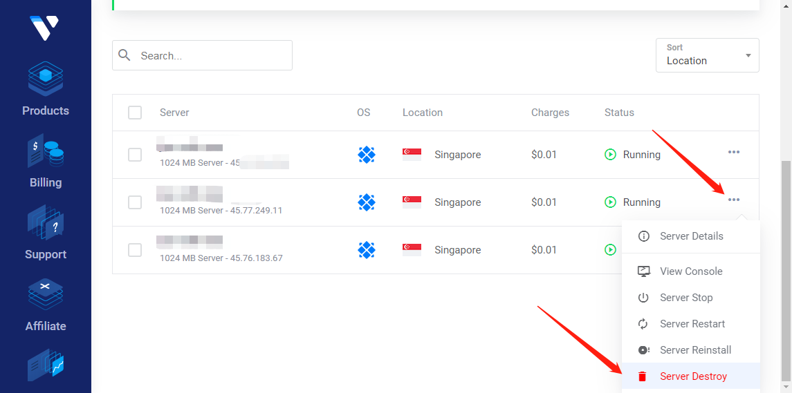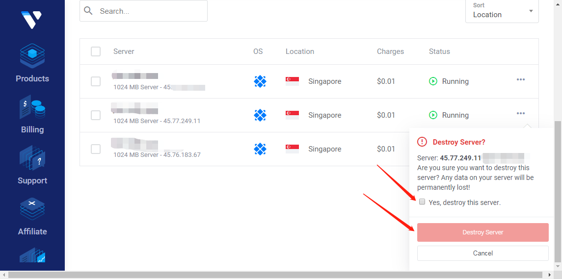 然后接着要做的就是把刚刚那两台IP被墙的VPS给销毁掉