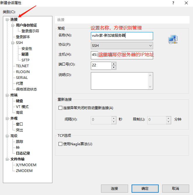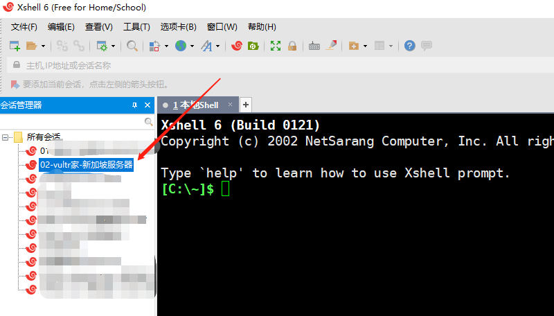 然后在Xshell左侧的【会话管理器】里面找到刚刚添加的【vultr家-新加坡服务器】