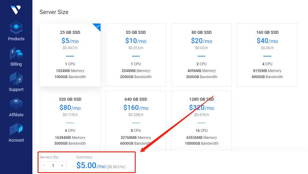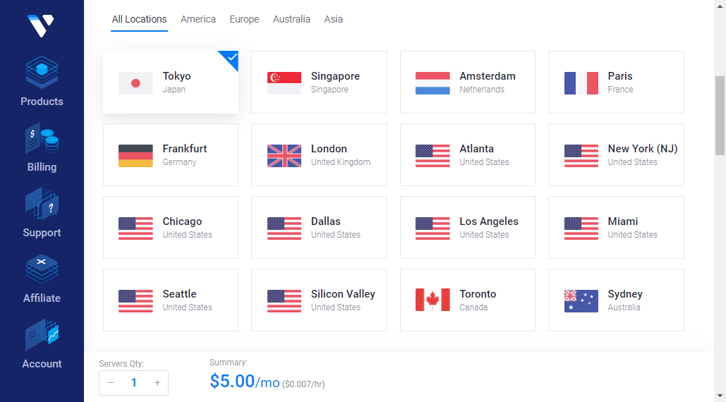 Vultr家拥有众多的不同档位的套餐可供选择,不过目前是月付5美元的套餐最为畅销