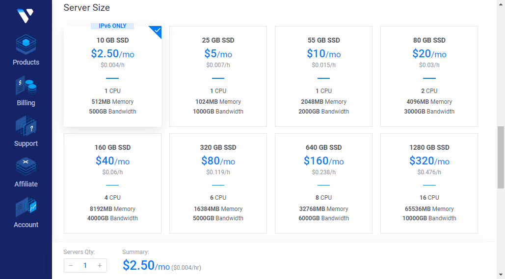 Vultr甚至在特殊的机房还能找到,月付2.5美元的VPS,不过遗憾的是只支持IPv6